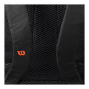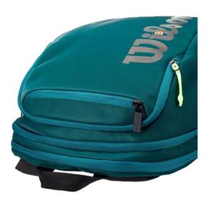 - Detalhamento: Possui cinco compartimentos, sendo um com capacidade de até duas raquetes sem capa, um compartimento espaçoso e com bolsos que acomodam pequenos pertences. Compartimento especifico para calçados ou roupas sujas com acesso externo. Dois bolsos nas laterais sendo um deles térmico. Todos compartimentos possuem fechamento em zíper. Escrita Wilson aplicada na parte da frente da peça e nas alças. Alças acolchoadas e reguláveis. Costas suavemente acolchoadas.