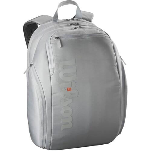 - Detalhamento: Possui cinco compartimentos, sendo um com capacidade de até duas raquetes sem capa, um compartimento espaçoso e com bolsos que acomodam pequenos pertences. Compartimento especifico para calçados ou roupas sujas com acesso externo. Dois bolsos nas laterais sendo um deles térmico. Todos compartimentos possuem fechamento em zíper. Escrita Wilson aplicada na parte da frente da peça e nas alças. Alças acolchoadas e reguláveis. Costas suavemente acolchoadas.