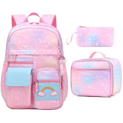 WQKMI Mochila para meninas, lindo conjunto de mochila escolar arco-íris para meninas e crianças, kawaii, escola primária para crianças e estudantes, Rosa fantasia, Tamanho único, Kawaii - Design e estilo exclusivos: nossa mochila kawaii para meninas possui bolsos laterais exclusivos de 180° para facilitar o armazenamento e remoção, cores dos sonhos e encantador bordado arco-íris, o que a torna o presente perfeito para adolescentes e crianças que voltam à escola, realizando todos os sonhos de princesa! - Conjunto de mochila escolar de 3 peças: este conjunto de volta às aulas inclui uma mochila estética para meninas (tamanho: 32 x 14 x 45 cm), lancheira isolada (tamanho: 27 x 9,9 x 19 cm) e estojo de caneta fofo (tamanho: 21 x 11 cm), oferecendo tudo o que seu filho precisa para escola em um conveniente Conteúdo da embalagem: - Confortável e resistente: Feito de poliéster resistente a rasgos, nosso kit de mochila infantil é leve e durável, garantindo uso duradouro. O design ergonômico inclui alças de ombro acolchoadas ajustáveis e painéis traseiros para transporte confortável, enquanto as tiras refletivas na alça de ombro melhoram a segurança noturna. - Grande capacidade e vários bolsos: nossa mochila escolar para meninas possui um prático bolso frontal grande de 180° com 4 bolsos de malha, 1 bolso com zíper e 3 suportes de caneta para armazenamento organizado. O compartimento principal acomoda livros, cadernos, um fichário e possui uma seção acolchoada para um iPad e laptop. Bolsos laterais elásticos protegem garrafas de água e guarda-chuvas, enquanto um bolso antirroubo na parte traseira adiciona segurança extra. Inclui uma lancheira e estojo. Ideal para itens essenciais escolares e muito mais. - Presentes perfeitos para meninas: nossa mochila escolar feminina kawaii combina perfeitamente elementos clássicos do arco-íris, oferecendo um acessório moderno e exclusivo. Incentive o amor do seu filho por aprender com esta mochila adorável e funcional! Ideal para voltar às aulas, aniversários, Natal e formatura, atende a todas as suas necessidades de presente. Seja para jardim de infância, pré-escola ou ensino fundamental, este conjunto de mochila versátil certamente encantará seu pequeno.