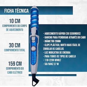 ficha técnica: - aquecimento rápido - gancho de parede - diâmetro 20mm - nível de ondulação exclusiva - peça de plástico slim para evitar o superaquecimento do produto - novo clipe projetado. Muito mais fácil de enrolar os cabelos - luz indicativa de energia - para todos os tipos de cabelo - aquecedor ptc com aquecimento rápido - cabelo modelado e saudáveis - 110-220v bivolt - 50/60hz 30w - espiral plástica para auxiliar os cachos e proteger os dedos - turbo em cerâmica - luz indicadora de funcionamento - compacto e leve - bivolt
