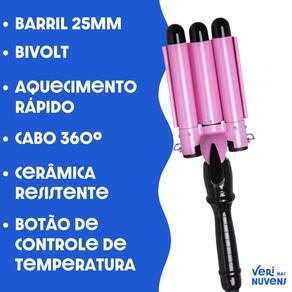 Modelador De Cachos Triondas Ondulador 25mm Bivolt Cacheador Conquiste cachos deslumbrantes e ondas de arrasar com o Modelador de Cachos Triondas Ondulador de 25mm Esse cacheador é simplesmente o 'Mago dos Cachos' que transformará seu cabelo em pura magia Com seu design inovador de triondas, ele é o segredo para cachos perfeitos que duram o dia todo. Nada de cachinhos tímidos, aqui é curvas poderosas e muito estilo E não se preocupe com a voltagem, esse mágico é bivolt Perfeito para te acompanhar em todas as suas aventuras, seja em casa ou em qualquer lugar do mundo. Então, prepare-se para receber elogios e olhares admirados, pois com o Modelador de Cachos Triondas Ondulador de 25mm, você vai arrasar em qualquer ocasião. Faça as ondas acontecerem, literalmente. O Triondas possui:- Efeito comprovado de ondas de praia e cabelo de sereia.- Fácil e rápido de usar, sem causar desconforto no braço.- Possui suporte e 3 barris modeladores para criar ondas deslumbrantes e duradouras.- Tecnologia Nano-Cerâmica que protege e deixa o cabelo cacheado e brilhoso, sem danos. Modo de usar :1- Deixe o aparelho aquecer por alguns minutos.2- Com o cabelo seco, pressione o botão e posicione a mecha no barril3- Aguarde de 5 a 30 segundos tempo define quanto irá ondular 4- Pressione o botão e solte a mecha do barril Características:- Voltagem: 110V / 220V Bivolt Automático - Potência: 40W- Tecnologia Nano-Cerâmica com aquecimento rápido e íons negativos- Luz indicadora de ligar/desligar- Ajuste de temperatura com dois níveis 180ºC e 200ºC - Tamanho do barril: 25mm Conteúdo da embalagem:1 x Modelador Triondas Cachos Profissional Marca: By-707C