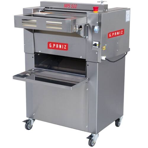 Modeladora de Pão com Pedestal MPS500 G.Paniz. Ideal para cozinhas industriais, hotéis, panificadoras, padarias e similares. Projetada como modeladora de massas de pão, com capacidade de modelar pães de até 500g. É fabricada em aço carbono SAE 1020 com em aço inox. Possui um gabinete fechado, com mancais em polipropileno injetado, rolamentos blindados, cilindros com acabamento em cromo duro. Esteira de transporte por cilindros, sistema de troca de feltros, sem necessidade de desmontar a máquina para a troca do mesmo. CAPACIDADE MÁXIMA: Pães até 500g. CONSUMO MONOFÁSICO: 0,35kWh. POTÊNCIA: 1/4CV. PESO: 120Kg. DIMENSÕES(CxAxL): 74x111x75cm. Equipamento certificado pelo OCP 0070 conforme Portaria INMETRO - 148/2022. Modeladora de Pão com Pedestal MPS500 G.Paniz é Atau.
