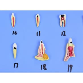Modelo anatômico de patologias dentárias em placa em 25 partes, confeccionado em PVC especial, com pintura feita a mão e cores realísticas; Várias patologias distintas estão representas neste modelo anatômico; Com o modelo anatômico de patologias dentárias com 25 partes SD-5059-M é possível identificar as seguintes estruturas dentre outras: