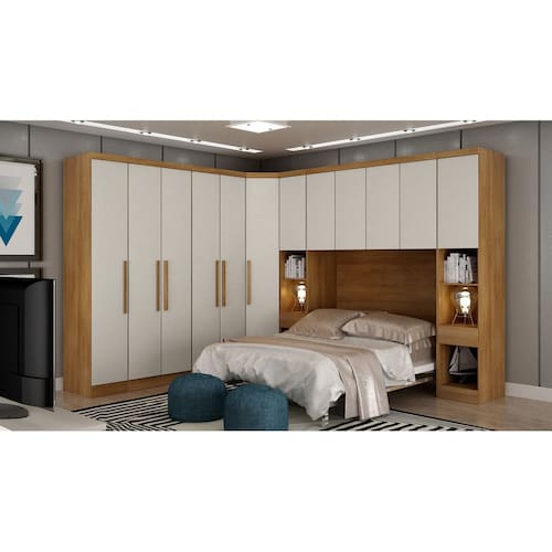 Modulado Casal Completo 6 Portas 6 Gavetas - Rizon - Móveis Novo HorizonteO Modulado Casal Rizon irá mudar o visual do seu quarto, pois ele possui um bom número de compartimentos, além de nichos e várias prateleiras que podem acomodar bolsas, roupas de camas, sapatos e o que mais você precisar para um dia a dia mais prático. Ainda conta com 6 gavetas espaçosas com corrediças telescópicas e 5 cabideiros. Perfeito, não é mesmo? Aproveite!Faz parte do anúncio:1 Módulo 1 Porta2 Módulos 2 Portas 3 Gavetas1 Módulo Canto Oblíquio2 Módulos Mesa de Cabeceira1 Módulo Aéreo CasalObs: Objetos de decoração, cama e colchão não acompanham o produto.Particularidades do Modulado:Características:- 100% MDF- Excelente espaço interno- 15 prateleiras internas- 8 gavetas com corrediças telescópicas- 5 cabideiros de alumínio- Dobradiças de pressão 35mm - Indicado para colchões até 1,38m ou 1,58mDimensão Total:Altura: 2,36 metrosLargura: 2,86x3,36 metrosDimensões Módulo 1 Porta:Altura 2,36 metrosLargura 40,8 centímetrosProfundidade: 56,5 centímetrosDimensões Módulo Canto Oblíquio:Altura 2,36 metrosLargura 82,7 centímetrosProfundidade: 69,5 centímetrosDimensões Módulo 2 Portas:Altura 2,36 metrosLargura 80,4 centímetrosProfundidade: 56,5 centímetrosDimensões Módulo Mesa de Cabeceira:Altura 2,36 metrosLargura 42,6 centímetrosProfundidade: 56,5 centímetrosDimensões Módulo Aéreo Casal:Altura 2,36 metrosLargura 1,67 metrosProfundidade: 56,5 centímetrosFIQUE ATENTO: Verifique se as medidas disponíveis do seu espaço são compatíveis com as medidas do modulado.Informações Importantes:.- Produtos podem apresentar diferenças de tonalidades entre a foto na tela e o produto real, devido a calibração de cor de tela.- Limpar com flanela ou pano macio. Não utilizar álcool. Não utilizar produtos abrasivos ou corrosivos.- Nós prezamos pela qualidade da entrega em primeiro lugar, trabalhamos com transportadoras altamente selecionadas e os melhores materiais de embalagem.- A montagem é de total responsabilidade do comprador. Antes de comprar, verifique o espaço disponível para a montagem.- Certifique-se de que o produto caiba em elevadores e vãos de escadas, não fazemos içamentos. Quaisquer despesas deste tipo ficam a cargo do cliente- Garantia de 3 meses contra defeitos de fabricação.