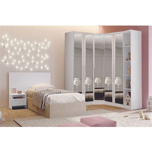 Modulado Closet Completo Espelhado 5 Portas 6 Gavetas - Rizon - Móveis Novo HorizonteO Modulado Solteiro Rizon possui um excelente padrão de qualidade combinando com qualquer ambiente, agregando beleza e sofisticação. Possui vários compartimentos, espaço para peças penduradas e dobradas, além de nichos que podem acomodar bolsas, roupas de camas, sapatos, brinquedos, decorações e o que mais você precisar para um dia a dia mais prático. Super versátil e elegante, encaixando perfeitamente no seu espaço. Confira e aproveite!Faz parte do anúncio:1 Módulo Cantoneira1 Módulo Canto Oblíquio2 Módulos 2 Portas 3 GavetasObs: Objetos de decoração, cama e colchão não acompanham o produto.Particularidades do Modulado:Características:- 100% MDF- Excelente espaço interno - 15 espelhos, sendo 3 por porta - 8 prateleiras - 6 gavetas com corrediças telescópicas- 4 cabideiros de alumínio- Dobradiças de pressão 35mm Dimensão Total:Altura: 2,36 metrosLargura: 1,64 x 1,94 metrosDimensões Módulo Cantoneira:Altura 2,36 metrosLargura 29,8 centímetrosProfundidade: 56,5 centímetrosDimensões Módulo 2 Portas:Altura 2,36 metrosLargura 80,4 centímetrosProfundidade: 56,5 centímetrosDimensões Canto Oblíquio:Altura 2,36 metrosLargura 82,7 centímetrosProfundidade: 69,5 centímetrosFIQUE ATENTO: Verifique se as medidas disponíveis do seu espaço são compatíveis com as medidas do modulado.Informações Importantes:.- Produtos podem apresentar diferenças de tonalidades entre a foto na tela e o produto real, devido a calibração de cor de tela.- Limpar com flanela ou pano macio. Não utilizar álcool. Não utilizar produtos abrasivos ou corrosivos.- Nós prezamos pela qualidade da entrega em primeiro lugar, trabalhamos com transportadoras altamente selecionadas e os melhores materiais de embalagem.- A montagem é de total responsabilidade do comprador. Antes de comprar, verifique o espaço disponível para a montagem.- Certifique-se de que o produto caiba em elevadores e vãos de escadas, não fazemos içamentos. Quaisquer despesas deste tipo ficam a cargo do cliente- Garantia de 3 meses contra defeitos de fabricação.