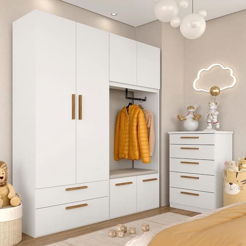 Conteúdo da Embalagem: 1Guarda Roupa 1Modulado 2 portas e Puff Baú 1Cômoda Manual de Montagem Kit Acessórios