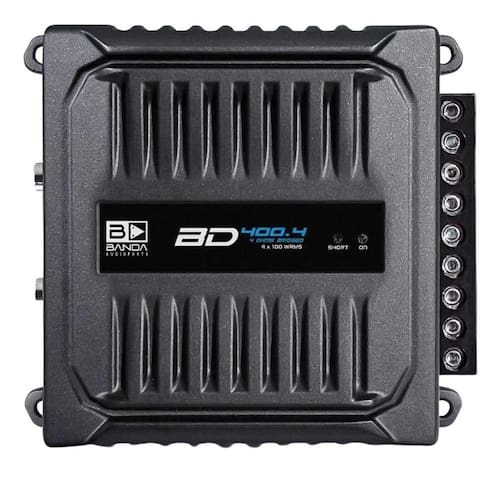 O 400.4 oferece 400Wrms com configuração de 4 canais de 100Wrms a 2 Ohms cada, ou 2 canais de 200Wrms 4 Ohms em Bridge. Esta linha é muito utilizada para sistemas de pequeno porte por aceitar várias configurações de instalação atendendo as mais diversas necessidades do mercado tocando qualquer tipo de alto falante, desde Subwoofers até Tweeters.Você poderá equipar o seu minissistema sonoro para garantir qualidade diária nas suas faixas. Por isso, o produto oferece 4 canais com impedância de 2 ohms e crossover ativo, além de um design moderno com carcaça preta na parte superior.- Classe de Operação: D- Potência Máxima 12,6v 2 Ohms: 4 x 100 WRMS- Potência Máxima 12,6v 4 Ohms: 4 x 65 WRMS- Potência Máxima 12,6v Bridge 4 Ohms: 2 x 200 WRMS- Potência Máxima 14,4v 2 Ohms: 4 x 140 WRMS- Potência Máxima 14,4v 4 Ohms: 4 x 85 WRMS- Potência Máxima 14,4v Bridge 4 Ohms: 2 x 280 WRMS- Crossover Ativo por Chave- Resposta de Frequência: 20Hz a 20kHz- Low Pass LPF: 20Hz - 90Hz 12dB/8- High Pass HPF: 90Hz - 20kHz 12B/8- Band Pass Flat - THD: 1%- Tensão de Entrada: 9 - 16V- Fusível Recomendado: 30A- Consumo Máximo Musical: 20A- Cabos de Alimentação Mín. : 10mm / 9 AWG- Cabos de Saída Mín. : 2 x 1,5mm / 2 x 15 AWG- Relação Sinal Ruído 85dB- Sensibilidade de Entrada: 180mV - 3,4V- Impedância de Entrada: 47K Ohms- Peso Kg : 0,78- Altura mm : 116- Largura mm : 127- Profundidade mm : 53