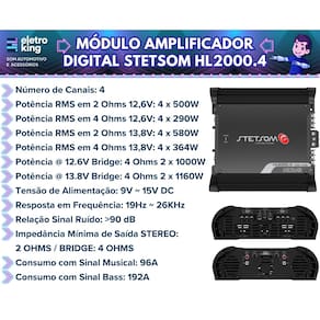 • 01 Módulo Amplificador Digital Stetsom HL2000.4 Canais • Manual e Certificado de Garantia.