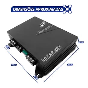 ESPECIFICAÇÕES TÉCNICAS: - Número de canais : 03; - Potência Máxima @ 13,8VDC : 100 WRMS x 2/2 Ohm(Stereo)/400 WRMSx1/4 Ohm(Subwoofer); - Distorção Harmônica Total (THD) : Menor que 0,5%; - Sensibilidade de Entrada (RCA) : 270 mV a 3,0 V; - Sensibilidade de Entrada (FIO) : 1,10 V a 8 V; - Relação Sinal Ruído : Maior que 90 dB; - Resposta em Frequência Stereo : 80 Hz a 30 KHz; - Resposta em Frequência Subwoofer : 20 Hz a 80 Hz; - Eficiência : Maior que 90 %; - Impedância de Entrada Low-in : 22K Ohm; - Impedância de Entrada High-in : 220 Ohm; - Controle de ganho : Stereo / Subwoofer; - Reforço de Graves ( BASS BOOST ) : 9 dB em 50 Hz; - Proteção Térmica / Curto : Sim; - Tensão de Alimentação Min. : 10,5 V; - Tensão de Alimentação Max. : 15,6 V; - Consumo em Repouso : 750 mA; - Consumo em Max. Potência : 30 A; - Dimensões: 173 mm x 154 mm x 41 mm (C x L x A); - Peso: 1 Kg.