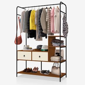 Com design industrial, possui 3 prateleiras e 2 gavetas, que ajudam a manter as roupas arrumadas.