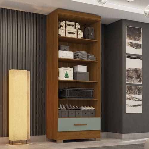 O Módulo Smart Plus, é uma solução moderna e funcional para otimizar espaços. Suas laterais, divisões, chapéus, prateleiras e gaveta são feitas em MDP de 0,12cm de alta qualidade, além de rodapés de 1,5cm. O fundo do roupeiro e da gaveta tem 0,3cm de espessura. Possui corrediças telescópicas suaves, interior na cor do produto, puxador da gaveta em MDF e cabideiro em alumínio. Oferece quatro possibilidades de montagem interna elencadas em seu manual de montagem de fácil entendimento. Ideal para quem busca praticidade, estilo e organização em um único móvel. Acabamento da Gaveta: Pintura Texturizada UV Acabamento da Prateleira: Pintura Texturizada UV Acabamento dos Pés: Pintura Altura dos Pés: 5,5 cm Ambiente Principal: Quarto codigo_ean: 7900288138835 Complexidade da Montagem: Média: pode ser montado por mais de uma pessoa e/ou necessite de maior conhecimento para montagem Composição: MDP Cor: Cinamomo/Verde Cor do Produto: Cinamomo/Verde Cor Interna: Bege Escala de Brilho: Fosco Espessura do Material da Estrutura: 15 mm Gaveta com Chave: Não Itens Inclusos: 1 Módulo, Manual de Montagem e Kit Ferragens Linha ou Coleção: Espresso Móveis Manual de Montagem e Instalação: https://product-hub-prd.madeiramadeira.com.br/882797/documents/22084e6b-168d-4248-943e-71a98322e32fontagemgr2124cod3005830059.pdf Marca: Espresso Móveis Material da Gaveta: MDP Material da Prateleira: MDP Material do Puxador da Gaveta: MDF Material dos Pés: PVC Material Principal: MDP Módulo Individual: Sim Montagem Flex: Sim, interior do produto pode ser montado da forma que o cliente desejar, contendo 4 opções elencadas no manual de montagem. Necessita Montagem: Sim Origem do Produto: Nacional Pés Reguláveis: Não Peso: 42,85 kg Peso Máximo por Gaveta: 5 kg Peso Máximo por Prateleira: 7 kg Possui Cabideiros: Não Possui Calceiros: Não Possui Espelho: Não Possui Possui Pés: 04 Possui Portas: Não Possui Prateleiras: 04 Possui Rodízio: Não Recomendações de Uso, Manutenção e Limpeza: pano levemente úmido Sapatas Niveladoras: Não Sistema de Montagem: parafusos, cavilhas e cantoneiras Suporta Até (kg): 10 kg Tipo de Corrediça da Gaveta: Metálica Telescópica Tipo de Puxador da Gaveta: Externo