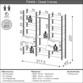 Closet Dalla Costa 3 torres (2 gaveteiros e cabideiro) 217,2cm, cor freijó/preto fosco 100% MDF, para maior durabilidade é aplicado 6 camadas de pintura, pode ser utilizado como divisória de ambientes, super moderno. Conheça toda a linha Dalla Costa Acabamento da Gaveta: Pintura Acabamento da Prateleira: Pintura Acompanha Lâmpada: Não Ambiente Principal: Quarto Complexidade da Montagem: Média: pode ser montado por mais de uma pessoa e/ou necessite de maior conhecimento para montagem Composição: MDF Cor: Freijó/Preto Fosco Cor do Produto: Freijó/Preto Fosco Cor Interna: Marrom Escala de Brilho: Fosco Escala de Brilho da Gaveta: Semi-Brilho Escala de Brilho da Prateleira: Semi-Fosco Gaveta com Chave: Não Itens Inclusos: 1 Closet e Manual de Montagem Linha ou Coleção: TW404 Manual de Montagem e Instalação: https://cdn2.madeiramadeira.com.br/atributo/dalla-costa/534697-tw402.pdf Material da Gaveta: MDF Material da Prateleira: MDF Material Principal: MDF Módulo Individual: Sim Necessita Montagem: Sim Origem do Produto: Nacional Painel para TV Integrado: Não Peso: 110 Peso Máximo por Gaveta: 8 Peso Máximo por Prateleira: 8 Possui Cabideiros: 01 Possui Calceiros: Não Possui Espelho: Não Possui Possui Organizador de Gaveta: Não Possui Pés: Não Possui Portas: Não Possui Prateleiras: 11 Possui Rodízio: Não Possui Vidro: Não Recomendações de Uso, Manutenção e Limpeza: Limpeza com pano levemente umedecido Resistente à Chuva: Não Rodízio com Trava: Não Sistema de Montagem: Parafusos, cavilhas e minifix Suporta Até (kg): 40 Tipo de Corrediça da Gaveta: Metálica Telescópica Tipo de Gaveta: Externa Tipo de Guarda-Roupa: Casal Ean: 7899676633420
