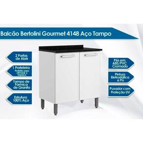 CARACTERÍSTICAS DE MÓVEIS Tipo de Estrutura do Móvel - 100% aço Tipo de Pintura - Eletrostática a Pó Tipo de Acabamento da Pintura - Alto Brilho Características de móveis - Gabinete Cooktop - Tampo em Fórmica de Granito Tipo de puxador - c/ Proteção UV Quantidade de Prateleiras - 1 Prateleira Quantidade de Portas - 1 Porta de Abrir Garantia - 3 meses