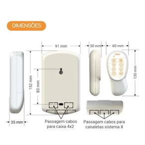 Alimentação do Módulo de Comando: Fonte 12Vcc vendido separadamente Amperagem da Central de Comando: 7,5A Potência da Central de Comando: 90W Alimentação do Controle Remoto: Pilha CR2032 Controle Remoto com alcance de 20 metros Controle Remoto com proteção contra respingos de água