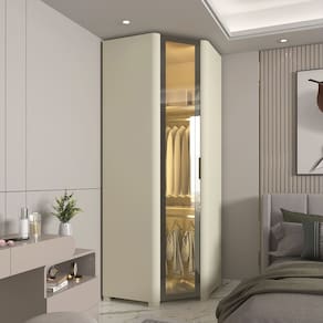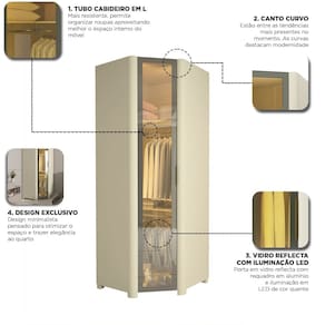 O Roupeiro de Canto com Porta de Vidro Reflecta foi desenvolvido para unir sofisticação, funcionalidade e aproveitamento inteligente de espaço. Seu interior oferece calceiro prático para manter calças organizadas, cabideiro em L que amplia a capacidade e facilita o acesso às roupas, além de iluminação em LED quente que valoriza as peças e proporciona um toque de elegância ao ambiente.