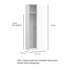 O Guarda Roupa de Canto Reto Modular Altezza Clean é ideal para você montar seu quarto utilizando o máximo de espaço possível. Móvel para compor com toda a linha modulada Altezza. A linha modulada é ideal para você planejar seu quarto da forma que quiser, utilizando melhor o espaço do seu cômodo, com móveis bonitos e de qualidade! Os módulos são compostos por painéis de 1,5 cm 100% MDF e pintura texturizada com 7 camadas (conferindo maior resistência à riscos e batidas). Com design inspirado nas tendências dos móveis planejados, seu grande diferencial é sua altura de 2,40m (uma das mais altas do mercado). As portas são equipadas com dobradiças Slow Motion (sistema de amortecimento) e as gavetas possuem corrediças telescópicas (para melhor deslizamento). Acabamento da Prateleira: Pintura Texturizada UV Acabamento da Porta: Pintura Texturizada UV Ambiente Principal: Quarto codigo_ean: 7900288190864 Complexidade da Montagem: Alta: deve ser montado por um montador especializado Composição: MDF Cor: Branco Cor do Produto: Branco Cor Interna: Branco Escala de Brilho: Fosco Espessura do Material da Estrutura: 15 mm Itens Inclusos: 1 Módulo, Kit Ferragens e Manual de Montagem Linha ou Coleção: Altezza Manual de Montagem e Instalação: https://product-hub-prd.madeiramadeira.com.br/192700190/documents/939abe02-c85d-4393-bc9b-3382014f61b83050912559817516310981045.pdf Marca: Belmax Material da Porta: MDF Material da Prateleira: MDF Material Principal: MDF Necessita Montagem: Sim O Módulo Pode ser utilizado individualmente: Sim Origem do Produto: Nacional Peso: 81 kg Peso Máximo por Prateleira: 10 kg Possui Espelho: Não Possui Pés: Não Possui Portas: 01 Possui Prateleiras: 04 Recomendações de Uso, Manutenção e Limpeza: Utilizar pano seco. Sistema de Montagem: Parafusos, cavilhas. Tipo de Dobradiça/Corrediça da Porta: Alumínio Tipo de Guarda-Roupa: Solteiro Tipo de Módulo: Guarda-Roupa Tipo de Puxador da Porta: Externo