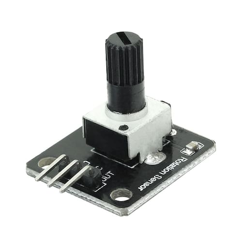 Este potenciômetro rotativo já vem montado em um módulo, o que facilita a conexão em projetos com microcontroladores. Possui 3 pinos de GND terra, VCC alimentação e OUT pino de saída.
