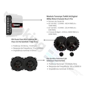 O Módulo Taramps TS400x4 Fio + Kit 2 Vias 6 JBL FLEX4 62VFX55 110W + Par 5TRFX55 110W é um conjunto completo para aprimorar o sistema de áudio automotivo. Com 400 watts RMS em 4 canais, o módulo Taramps permite uma personalização eficiente do som. O Kit 2 Vias JBL FLEX4 62VFX55 oferece áudio nítido com alto-falantes de 6 polegadas (110W RMS). Incluindo o Par 5TRFX55 110W para potência adicional, esse conjunto proporciona uma experiência sonora de alta qualidade para transformar o ambiente do veículo em um espaço acústico excepcional.