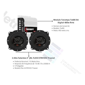 O kit inclui o Módulo Taramps TS400x4, um amplificador de quatro canais com 400 watts RMS, e um par de Alto Falantes 5 JBL FLEX4 5trfx55, cada um com 110 watts RMS. Essa combinação proporciona uma potência significativa e qualidade sonora excepcional para aprimorar o sistema de áudio do veículo. O amplificador Taramps oferece versatilidade, enquanto os alto-falantes JBL garantem agudos cristalinos e graves profundos. Ideal para entusiastas de áudio automotivo em busca de uma experiência sonora envolvente e de alta qualidade.