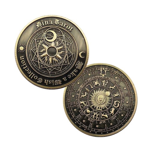 Material: ferro Peso: 12 g Tamanho: 3 x 0,2 cm Embalagem: 1 x CoinMystic Tarot Design — Apresenta gravuras celestiais intrincadas com os símbolos do sol, da lua e do zodíaco, refletindo temas de tarô e astrologia. Simbolismo de dupla face — Um lado exibe um mapa estelar no estilo tarô, enquanto o outro mostra meses e constelações ao redor de um sol radiante. Acabamento em bronze antigo — Feito de ferro durável com um visual retrô em tom de bronze para um apelo místico e colecionável. Compacto e leve — mede 3 cm de diâmetro e 0,2 cm de espessura, fácil de transportar como amuleto da sorte ou guardar em uma coleção. Moeda de Astrologia e Tarô — Perfeita para leitores de tarô, entusiastas de horóscopos e aqueles que apreciam designs místicos.