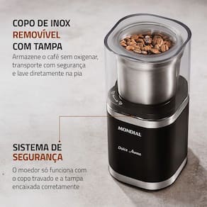 Prático e funcional, possui tampa com trava de segurança e acionamento por pressão, que permitem controlar facilmente o tipo de moagem, da mais fina à mais grossa, ideal para diferentes métodos de extração, como espresso ou coado.