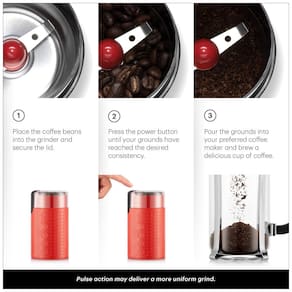 Moedor de café e grãos elétrico profissional Bodum Bistro Blade com lâmina de aço inoxidável, capacidade de 1000g, motor de 150W, controle por botão de pressão e tampa transparente para ajuste da moagem.Desmontável