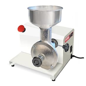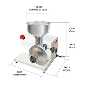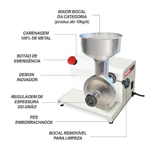 Conta com um bocal de metal para inserção dos grão, um sistema integrado de segurança integrado para paralisação total do equipamento em casos de emergência e um motor de alta tecnologia com placa integra e 1/3CV de potência, para máximo desempenho do produto. Além disso possui 4 pés emborrachados para que o moedor de grãos não fique se movendo durante o uso. Sua capacidade de produção é de 10kg de grãos por hora.