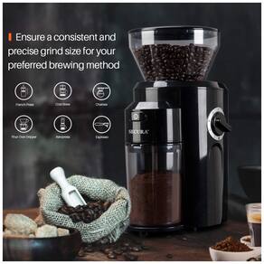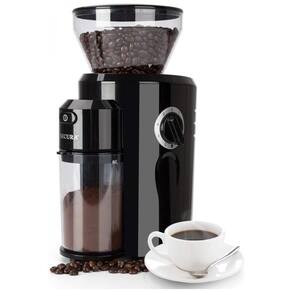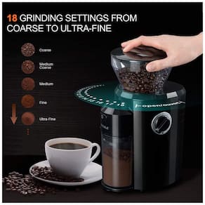 Moedor de café elétrico com 18 configurações de moagem, rebarbas cônicas, funil espaçoso e operação fácil com botão de controle de quantidade de 1 a 10 xícaras.Desmontável