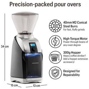 Moedor de café elétrico Baratza com 40 configurações de moagem, temporizador digital, recipiente de borras retroiluminado por LED e rebarbas cônicas de liga de aço temperado.Funcionamento
