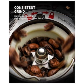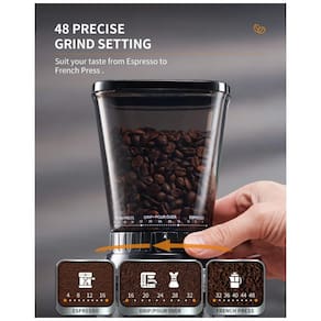 Moedor de café elétrico com 48 configurações de moagem, temporizador eletrônico de precisão, tela LCD touch, tecnologia antiestática e funil de grãos de café com sistema de travamento.Desmontável