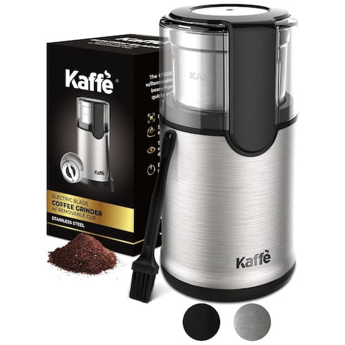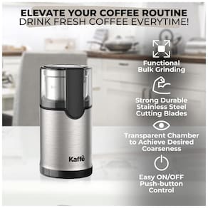 CAFÉ FRESCO, SEMPRE A moagem dos grãos de café imediatamente antes do uso libera os óleos essenciais perfumados dos grãos de café no momento certo para garantir o máximo de frescor e aroma rico para um sabor complexo e encorpado, satisfazendo o café com o sabor mais delicioso no conforto da sua própria casa. O moedor de café elétrico de bancada COMPACTO 133mL transforma rapidamente grãos inteiros em café moído na hora direto da sua casa ou cozinha. EQUILÍBRIO PERFEITO POTÊNCIA E PORTABILIDADE. Moedor de café elétrico de bancada compacto com capacidade de 133mL, lâmina de aço inoxidável 304 de alta qualidade e motor potente atualizado de 150 W para melhor manter o rico aroma e o óleo do grão de café. USO MÚLTIPLO Kaffe não é apenas uma moagem de café perfeita. Kaffe oferece os melhores moedores para todas as suas necessidades de cozinha. Você pode usá lo com confiança como um moedor de especiarias para ervas, nozes e grãos. Com uma ESCOVA DE LIMPEZA incluída, você pode limpar facilmente seu moedor de grãos de café