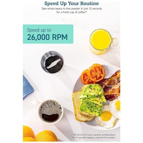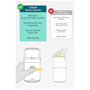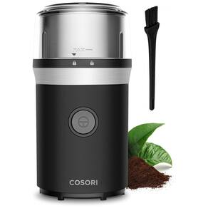 Moedor de café elétrico portátil Cosori em aço inoxidável com lâmina de aço inoxidável e motor de 200W. Moagem ajustável (grossa, média e fina) com proteção contra superaquecimento e tampa de segurança.Funcionamento