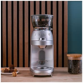 O equipamento oferece 30 ajustes de moagem voltados à faixa de espresso, abrangendo configurações de mais finas a médias, de acordo com a calibração da máquina e do tipo de blend utilizado. A base com pés antiderrapantes e corpo em alumínio com acabamento inox foram dimensionados para uso sobre bancadas de cozinha, com altura compatível com armários padrão. O modelo integra a linha de preparo de café da marca, funcionando como complemento para máquinas de espresso Smeg ECF02 e EMC02.