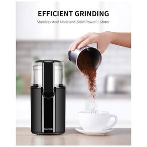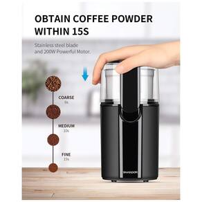 Moedor de grãos SHARDOR com lâminas de aço inoxidável, capacidade para 70g, potência de 200W, controle de espessura de moagem por tempo de pressão na tampa, copo removível para lavagem e fio colecionável.Vendido e entregue por Ecletiq