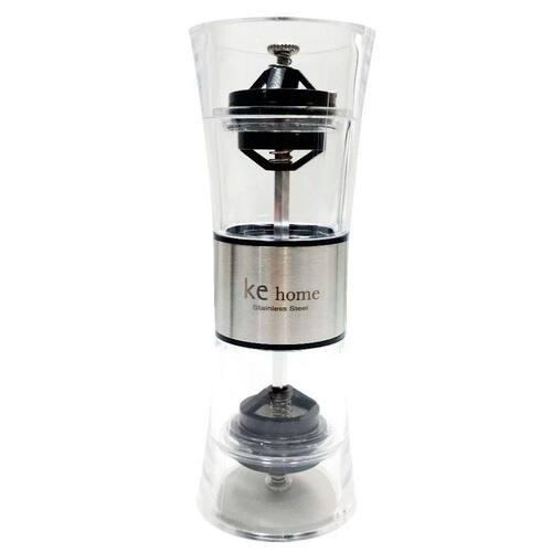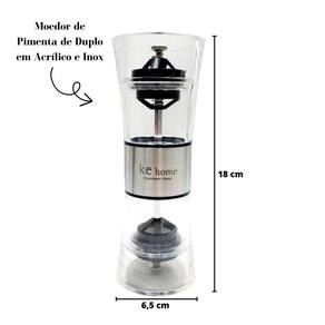 O Moedor de pimenta duplo em acrílico e inox manual é um utensílio de cozinha projetado para moer pimenta em grãos de maneira eficiente. Esse tipo de moedor possui um design compacto e elegante, combinando materiais duráveis e esteticamente agradáveis. O corpo do moedor é feito de acrílico transparente, que permite visualizar facilmente a quantidade de pimenta restante no compartimento. O acrílico é resistente a impactos e é um material leve, o que torna o moedor fácil de manusear.