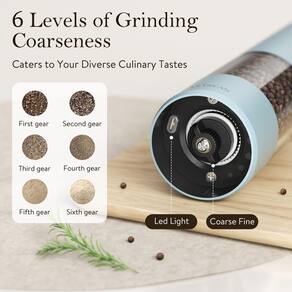 - Moedor ajustável: 6 configurações de moagem com um núcleo de cerâmica que mói até 25 mícrons — preservando o aroma e o sabor autênticos da pimenta