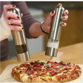 O moedor de pimenta ou sal é produzido em material altamente resistente à corrosão, durável e com excelente padrão de qualidade. O moedor elétrico combina com a mesa elegante e de sabor refinado. Características: Produto de alta qualidade Aço inoxidável revestimento exterior. Indicado para moagem de pimenta, semente de mostarda e outras especiarias de pequeno porte. com parafuso na parte inferior para ajustar a grossura da especiaria. Dimensões: 22,5 cm x 5,2 cm x 5,2 funciona com 4 pilhas AA não inclusa Instruções de uso: 1-Basta remover a capa em aço inox na parte superior do moedor e cuidadosamente retirar o copo plastico 2-Preencha, com as especiarias de sua escolha, a área de visualização transparente e remonte a tampa superior 3-Pressione o botão de cima para faze-lo funcionar. Ean: 7899670804284
