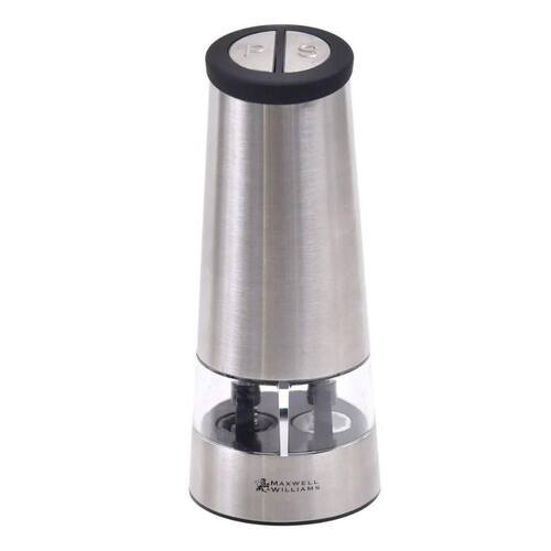 Moedor elétrico duplo para sal e pimenta com corpo em aço inoxidável escovado e câmaras em acrílico transparente. Possui mecanismo de moagem em cerâmica de alta durabilidade e operação automática com o toque de um botão.Base recarregável