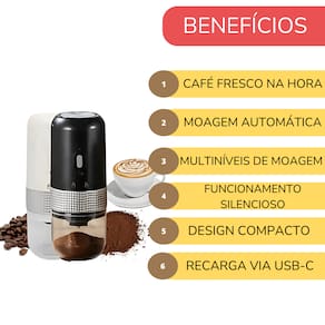 O Moedor de Café Recarregável USB é ideal para quem valoriza o sabor e o aroma do café moído na hora. Projetado para verdadeiros apreciadores, ele combina praticidade, elegância e tecnologia para moer grãos com máxima precisão e preservar o sabor original da bebida. Com lâminas de cerâmica e várias configurações de moagem, você escolhe desde o pó mais fino para espresso até o mais grosso para prensa francesa. Tudo isso com operação silenciosa, autodesligamento inteligente e carregamento rápido via USB-C. Compacto e resistente, o moedor possui estrutura em plástico reforçado e proteção contra superaquecimento, garantindo segurança e durabilidade no uso diário. Seu design moderno e portátil permite fácil transporte e limpeza, ideal para quem valoriza praticidade sem abrir mão da qualidade. Ele é o acessório essencial para elevar a sua rotina de preparo do café com eficiência e muito mais sabor. CARACTERÍSTICAS: .Cabeça de moagem cônica em cerâmica .Multiconfigurações de moagem: do ultrafino ao extragrosso .Moagem automática com desligamento inteligente .Operação silenciosa (menos de 65 dB) .Recarga via USB-C (tempo de carga de 1h30min) .Compartimentos removíveis para facilitar a limpeza .Ideal para uso doméstico ou em viagens ESPECIFICAÇÕES TÉCNICAS: .Capacidade de moagem: 30g .Capacidade do recipiente: 120ml .Potência: 13W .Bateria: Li-pol 3.7V, 1250 mAh .Comprimento do cabo: 50 cm .Lâminas: Cerâmica .Estrutura: Plástico reforçado .Proteção contra superaquecimento: Sim .Tela digital: Não .Dimensões: 18 cm (C) x 6 cm (L) x 6 cm (P) .Peso: 360gVendido por MINUTOBABY MANIA e entregue por Extra