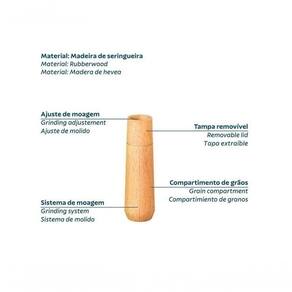 - Moedor em madeira seringueira com pino regulador de tamanho de grão, para que seja ajustado conforme seu gosto.