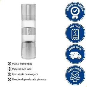 - Moedor de Sal e Pimenta Tramontina Duplo em Aço Inox e Acrílico com Moinho em Cerâmica da linha Realce tornará o seu dia a dia na cozinha mais prático e garantirá a beleza da sua mesa.