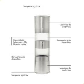 - O moedor duplo de sal e pimenta, possui design clean e arrojado, levando beleza e praticidade para seu dia a dia;