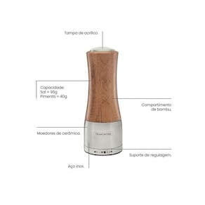 Mais informações - Prático e elegante!Possui engrenagens de alta resistência, proporcionando maior durabilidade.Com ajuste de moagem, possui regulador de tamanho de grão, para que seja ajustado conforme seu gosto.Garantindo higiene e beleza.Material: Bambu + aço inoxMoedores de cerâmica.Compartimento de bambu.Tampa de acrílico.Capacidade:Sal = 95 GPimenta = 40 G