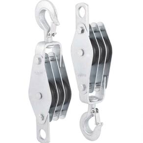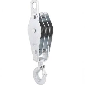 Possui acabamento zincado, proporcionando maior resistência a oxidação/corrosão, gancho com trava proporcionando maior segurança e polias de nylon de alto impacto proporcionando maior durabilidade.