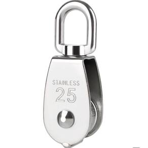 INFORMAÇÕES ADICIONAIS: Material: Aço inox 316. Tamanho: N25. Carga máxima: 150 kg. Dimensões: 85mm x 30mm x25mm x23mm Contém alça destorcedor. Alta resistência e durabilidade. Projetado para pendurar objetos de peso para aliviar cargas Aplicação: Amplamente utilizado no esforço de tração de cabos de aço ou outras ferramentas de cabos. Uma corda, cabo, correia ou corrente geralmente passa sobre a roda e dentro da ranhura, se houver
