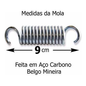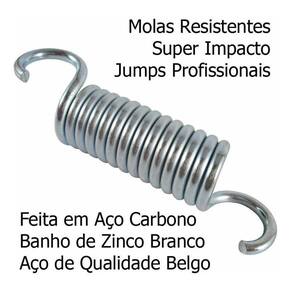 Molas Profissionais para Jump Mini Cama Elástica - 50 UnidadesMolas em alta qualidade feitas em aço carbono, alto impacto para que tenham uma vida útil maior, produto profissional, ótimo material e qualidade.- Material Superior Aço Carbono Belgo Mineira- Molas com Banho de Zinco Branco- Muito ResistentesEspecificações Técnicas- Espessura do fio: 0,3 cm- Diâmetro externo da mola: 1,8 cm- Diâmetro interno da mola: 1,2 cm- Comprimento total da mola: 9 cm aproximadamente- Peso do produto unidade : 55 gramas- Elasticidade / Tensão da mola: 50% da medida