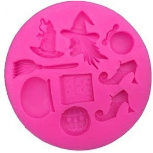 Medida da peça pronta: Bruxa - 3*2cm; Chapéu - 2*1,9cm; Vassoura - 3,5cm*0,9mm; Sapatos - 1,2*2cm; Abóbora - 1,6cm; Caldeirão - 1,6*2,2cm. Livro - 1,8*1,6cm.