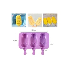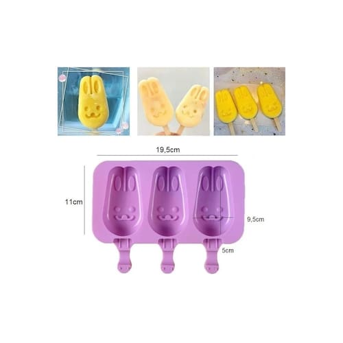 Molde para gelado con 3 cavidades de forma de conejito- Cor: violeta- Material: silicone.- Inclui tapa.- Medidas: 11 cm de largura x 19,5 cm de largura x 2,5 cm de profundidade.- Usa o molde para fazer barras de gelado con forma de conejito para los pequeños de la casa.- É reutilizável, antiaderente, suave e fácil desmoldar y limpiar.- Ideal para fazer paletas de sorvete para crianças, famílias, festas, férias, reuniões, aniversários, revelação de sexo.- Pode ser com iogurte, suco, chocolate e muito mais. O pacote inclui:1x molde de gelado em forma de coelho com sua tampa e palos de madeira.