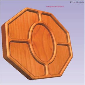 Molde para trabalhar com madeira bruta de diferentes espessuras, ideal para fabricar petisqueiras. Para evitar acidentes, fixe bem o molde na madeira e na bancada. Utilize uma fresa de 12 a 13mm de diâmetro, com topo reto, e acompanhe o curso do molde com uma guia copiadora da tupia ou com uma fresa com rolamento na haste.