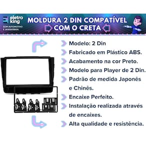 A moldura 2 Din preta para o automóvel Creta, especificamente de origem japonesa ou chinesa, é um acessório automotivo projetado para permitir a instalação de um aparelho de som ou multimídia de 2 Din no painel do veículo. A expressão 2 Din refere-se ao padrão de tamanho duplo DIN, que é o dobro da altura de um aparelho de som padrão DIN simples, com dimensões aproximadas de 180 mm x 100 mm.
